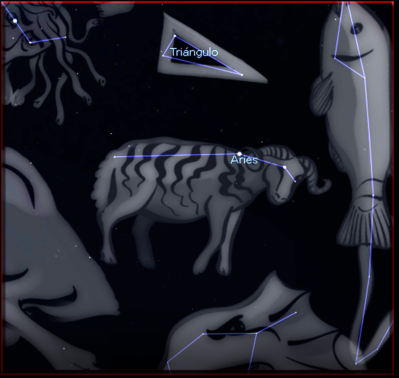 Aries, el Carnero, se encuentra entre Piscis al oeste y Tauro al este. Su estrella principal es Hamal (Arietis), que en árabe significa, carnero. Una gigante anaranjada rodeada de un hermoso grupo de estrellas. Su radio es 15 veces mayor que el radio del Sol. En 2011 se detectó un planeta con un tamaño casi el doble que Júpiter orbitándola. Cuando los griegos dividieron la eclíptica en los signos del zodiaco el punto del equinoccio vernal o de primavera correspondían a esta constelación, pero debido al movimiento de precesión de la Tierra, ahora este punto se sitúa en la constelación de Piscis. Dentro de 22000 años volverá a Aries. La constelación de Aries es conocida por sus lluvias de meteoros, entre ellas, las Épsilon Ariétidas y las Aríetidas de mayo y las Ariétidas diurnas en verano, estos el mejor momento son durante el amanecer y la puesta de sol.