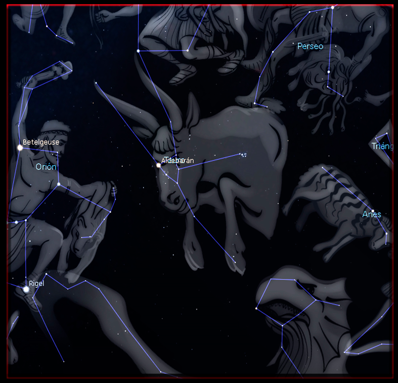 Tauro, el Toro. En latín Taurus. Destaca en el cielo de invierno entre Orión y Perseo. Aldebarán, es su estrella principal, brillando de color naranja. El ojo de Tauro. Elnath es la segunda estrella más brillante, una gigante blanca azulada, que junto a Tianguan forman los cuernos del Toro. La constelación de Tauro cuenta con dos de los cúmulos abiertos más conocidas del cielo de invierno, las Pléyades M45 y la Hiades, cúmulos cercanos al Sistema Solar, 444 años luz las Pléyades y a 153 años luz las Hiades. Podemos encontrar en Tauro la Nebulosa del Cangrejo M1, resto de supernova, a una distancia de 6500 años luz de la Tierra, en su centro está el Púlsar del Cangrejo cuyo penado de rotación es de 33 milisegundos.