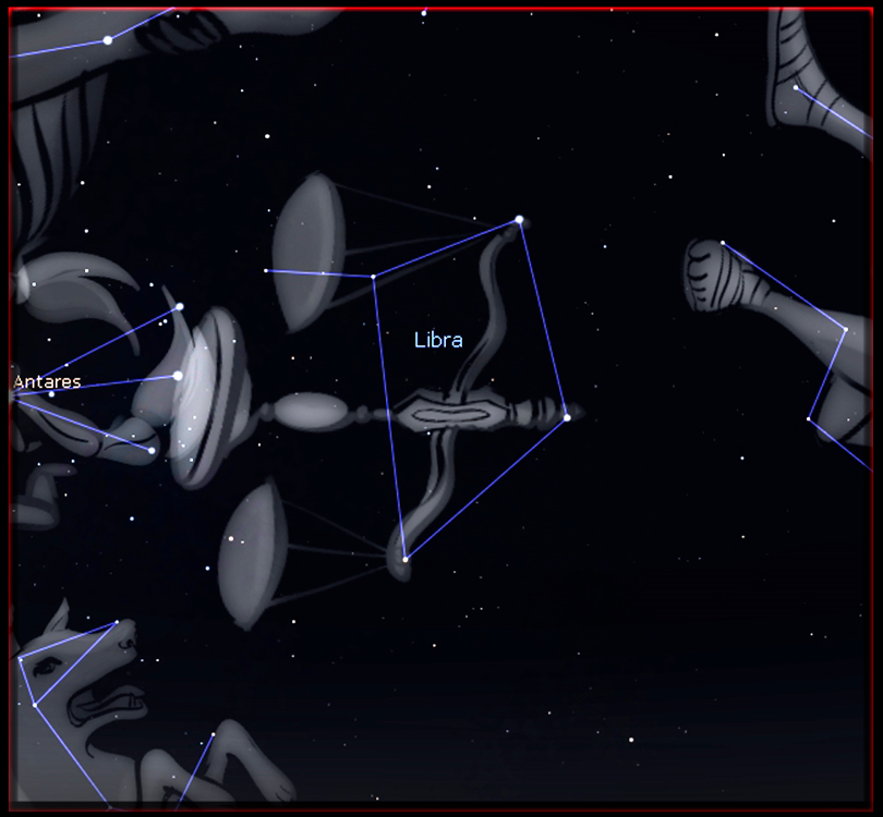 Libra, la Balanza. Se encuentra entre Virgo al Oeste y Escorpio al Este. Originalmente las estrellas de Libra se consideraban parte de la constelación de Escorpio. Sus principales estrellas aun tienen el nombre de esta relación. Zubenelgerubi significa "pinza del sur" Y Zubeneschamali "pinza del norte". Es una constelación débil y pequeña. En libra encontramos la estrella Gliese 581 una enana roja a 205 años luz de la Tierra. Tiene a su alrededor 6 planetas. El exoplaneta Gliese 581g orbita en el centro de la zona de habitabilidad Gliese581c orbita el interior de la zona y Gliese581d ocupa el borde exterior. Serían los primeros planetas que cumplen los requisitos fundamentales para albergar vida. Podemos encontrar unas cuantas galaxias espirales NGC 5728, 5792 y 5885, así como dos galaxias elípticas NGC 5898 y 5903.