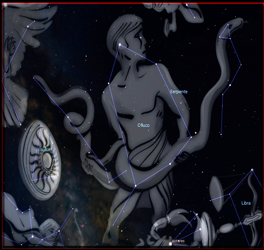 Ofiuco, conocido como "Cazador de Serpientes". Se encuentra entre Escorpio al Oeste y Sagitario al Este. Representa un hombre que aguanta una serpiente, Serpens, o parece llevarla enrollada al cuerpo, Serpens Caput, la cabeza de la serpiente y Serpens Cauda, la cola de la serpiente. Su principal estrella recibe el nombre de Rasalhague o Raas Alhague. Es una gigante blanca. Se encuentra a una distancia de 46.7 años luz. La Estrella de Barnard es, después de Alfa Centauri, a 4.36 años luz, la estrella más próxima al Sol, situada a 5.96 años luz. No es una constelación muy brillante pero tiene objetos interesantes y rico en cúmulos globulares, M9, M10, M12, M14, M19, M62 y M107. Nebulosas planterias, Nebulosas Alas de Mariposa M2-9 y Nebulosa del Pequeño Fantasma NGC 6369 NG6240 que es un remanente del choque de dos galaxias, dando lugar a una más grande con dos núcleos.