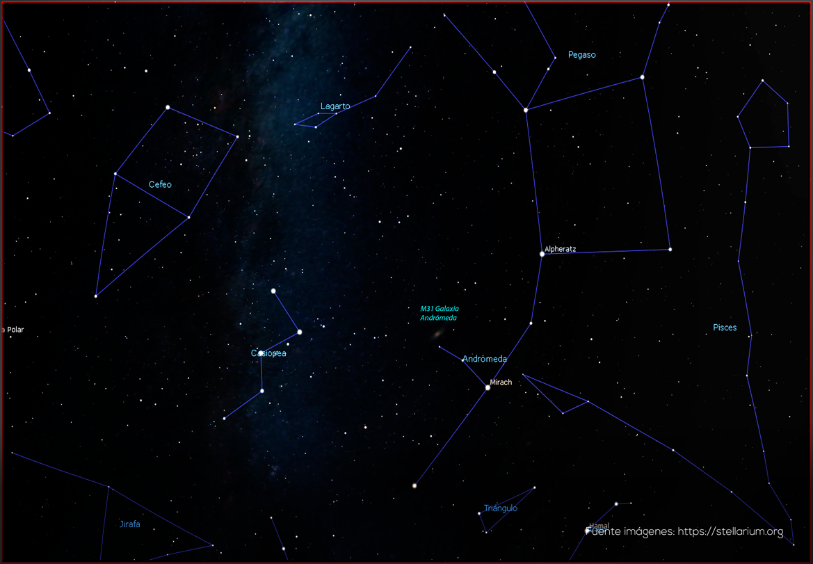Andrómeda era hija de Cefeo y Casiopea, constelaciones también cercanas a ella. La constelación puede verse durante todo el año. Famosa por que cerca de ella se encuentra M31, la Galaxia de Andrómeda. Alpheratz o Sirah es su estrella más brillante, en realidad es una estrella binaria, formada por dos estrellas que orbitan una alrededor de la otra. También la comparte con la constelación de Pegaso, llamándose Pegasi. Mirach es su seguda estrella más brillante, su nombre proviene del árabe, al-maraqq, y significa "los lomos". Es una gigante roja con un radio 86 veces más grande que el radio solar y 1.900 veces más luminosa que el Sol. Esta a una distancia de unos 200 años luz. Unos de los objetos de espacios profundo más importantes es M31, la Galaxia de Andrómeda, una galaxia espiral barrada el doble de grande que nuestra galaxia. Tiene galaxias satélites y destacan junto a ella M31 Y M110.