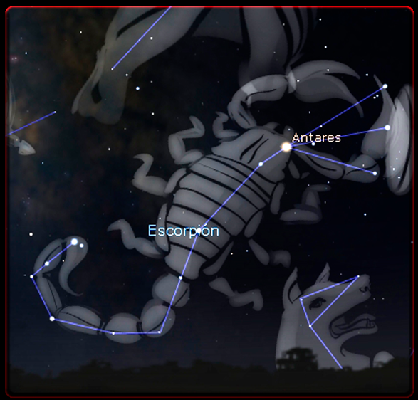 Es la estrella más brillante de la constelación de Escorpio. Una supergigante roja situada a 550 años luz y es la decimosexta más brillante del cielo nocturno. Se acera a nosotros a una velocidad de 3.4lkm/sg. Si estuviese en el lugar del Sol, su superficie se entendería entre Marte y Jupiter. Antares acabará sus días estallando como una espectacular supernova pudiendo dejar como remanente una estrella de neutrones o un agujero negro. Su nombre proviene del girego "anti Ares" y significa el rival de Ares debido a su color rojizo y que rivaliza en el cielo con Marte en girego "Ares" que pasa cerca de esta estrella cada 1 año y 11 meses. En árabe recibe el nombre de "Kalb al Akrab" (el corazón del escorpión) debido a la situación de la estrella en el centro de la constelación.