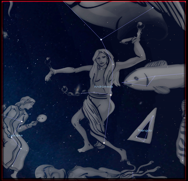 Andrómeda era hija de Cefeo y Casiopea, constelaciones también cercanas a ella. La constelación puede verse durante todo el año. Famosa por que cerca de ella se encuentra M31, la Galaxia de Andrómeda. Alpheratz o Sirah es su estrella más brillante, en realidad es una estrella binaria, formada por dos estrellas que orbitan una alrededor de la otra. También la comparte con la constelación de Pegaso, llamándose Pegasi. Mirach es su seguda estrella más brillante, su nombre proviene del árabe, al-maraqq, y significa "los lomos". Es una gigante roja con un radio 86 veces más grande que el radio solar y 1.900 veces más luminosa que el Sol. Esta a una distancia de unos 200 años luz. Unos de los objetos de espacios profundo más importantes es M31, la Galaxia de Andrómeda, una galaxia espiral barrada el doble de grande que nuestra galaxia. Tiene galaxias satélites y destacan junto a ella M31 Y M110.